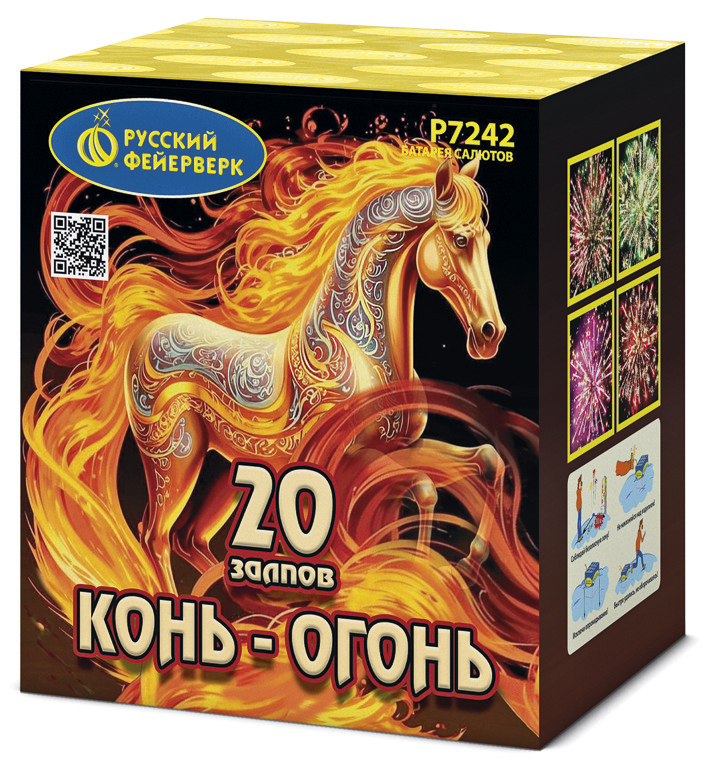 Купить товар Салют Р7242 Конь-огонь Батарея салютов 0,8 х20 залпов Русский фейерверк по низкой цене можно на сайте в 1 клик, либо по бесплатному телефону 8 (800) 250-5782.